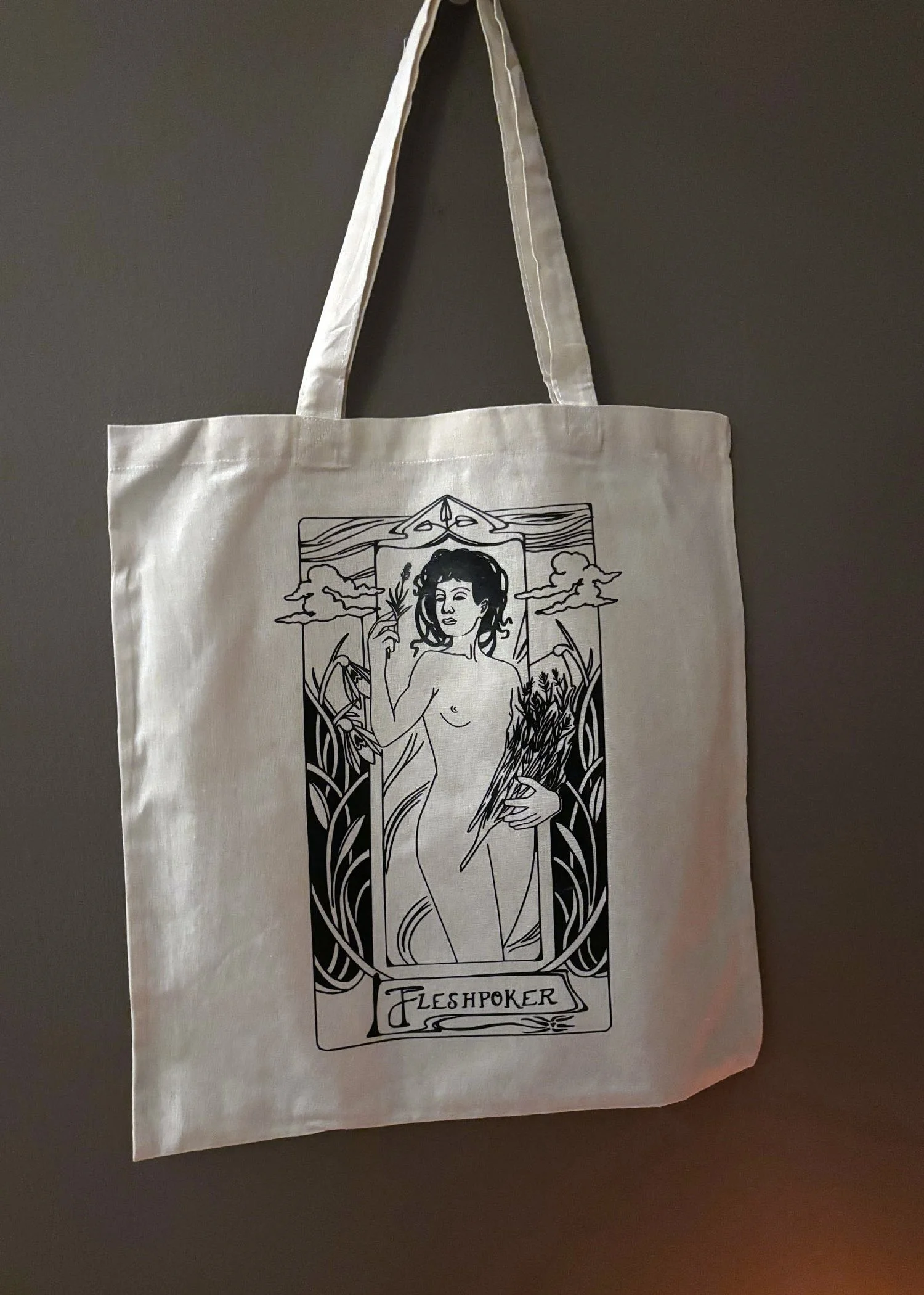 Shop › Aquarian Fleshpoker tote Image 1 of 1 Aquarian Fleshpoker tote $30.00 One time design drop, hand made, original design. +shipping No exchanges or refunds, wash cold / air dry Quantity: Add To Cart Added! One time design drop, hand made, original design. +shipping No exchanges or refunds, wash cold / air dry